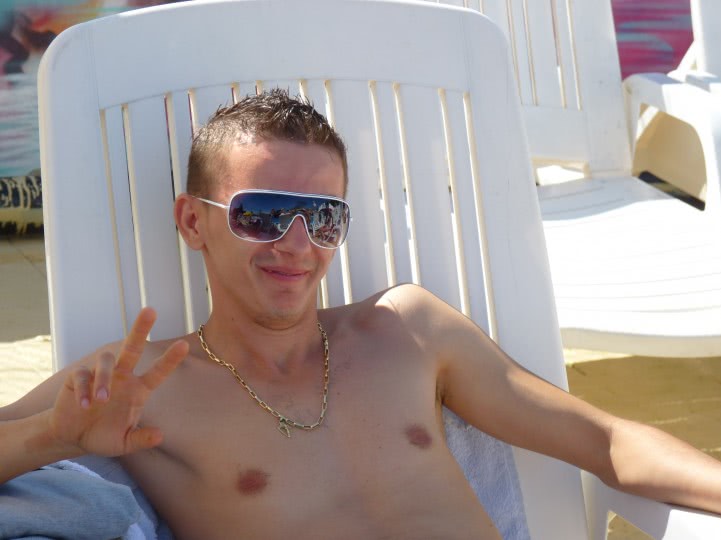 Foto: cameriere sex .jpg un barbat fara tricou, relaxat pe plaja, sta in fotoliu cu semnul pacii in mana si ochelari de soare. soarele scalda pielea sa bronzata, iar bijuteriile ii stralucesc subtil pe gat si pieptul dezgolit. nisipul fin si umbrela colorata completeaza atmosfera sensuala, accentuand farmecul sau natural si atractia intensa.