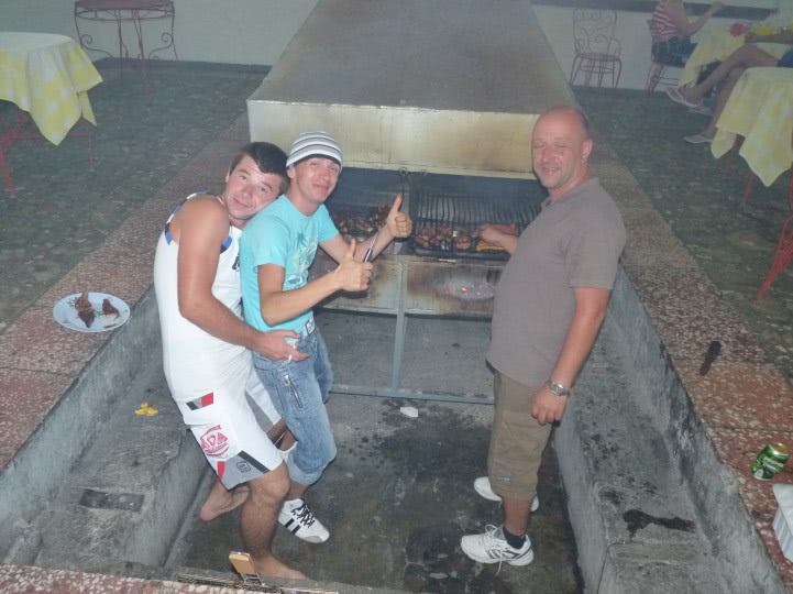 Imagine: vedete fara chiloti .jpg trei persoane stau in fata unui gratar cu o pizza pe el, iar un barbat tine o bere in mana. realism fantastic si elemente de groaza corporala se regasesc in aceasta fotografie. doua fete cu par negru poarta bratara si ceas la mana, alti barbati si fete sunt prezenti in cadru. imaginea surprinde atmosfera relaxata a unei zile petrecute afara, sub soarele stralucitor.