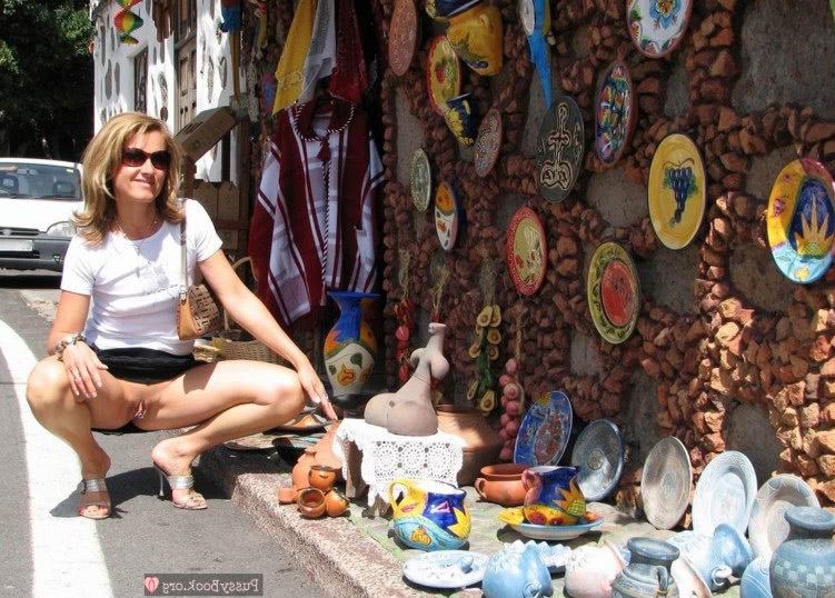 Imagine: joc porno de intuitie casa vampirilor .jpg o femeie sta pe o margine langa un perete plin cu vase si farfurii expuse in fata unui magazin, arabescuri, figurina, o sculptura suprarealista. anna hotchkis, 1 fata, desculta, cu par blond, pisica, mancare, bijuterii, par lung, realista. stand in pozitie ghemuita cu ochelari de soare.