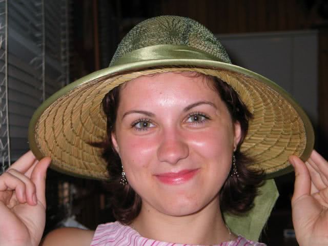 o femeie seducatoare pozeaza incantatoare, cu o palarie de paie si zambet sarmant. mainile isi ridica delicat palaria, dezvaluind un chip cu buze moi si pete fine pe obraji. privirea seduce, iar aerul ei intim emana o senzualitate subtila, in timp ce in fundal se zareste o colivie veche, adaugand un strop de mister acestei scene pline de farmec si erotism.