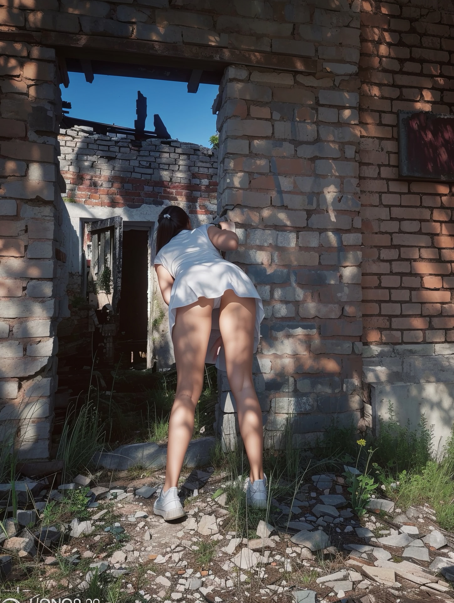 Imagine: fututa in colanti .jpg o femeie intr-o rochie alba, sprijinita de un perete de caramida, isi arata posteriorul fermecator si piciorul ridicat seducator. Intr-un peisaj post-apocaliptic, printre ruine si ferestre cu sarma ghimpata, ea emana o senzualitate incendiara, in timp ce privirea ei misterioasa te invita la o aventura erotica plina de pasiune.
