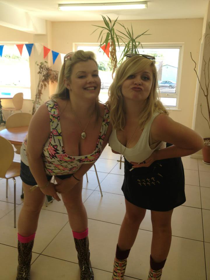 doua femei seducatoare, imbracate in fuste scurte si cizme elegante cu sireturi, se apleaca provocator, evidentiind busturile voluptoase si decolteul ademenitor. parul lung si blond le cade peste umeri, iar bijuteriile stralucitoare completeaza look-ul irezistibil. In fundal, steaguri si mese adauga o atmosfera intima intr-o camera plina de farmec si mister.