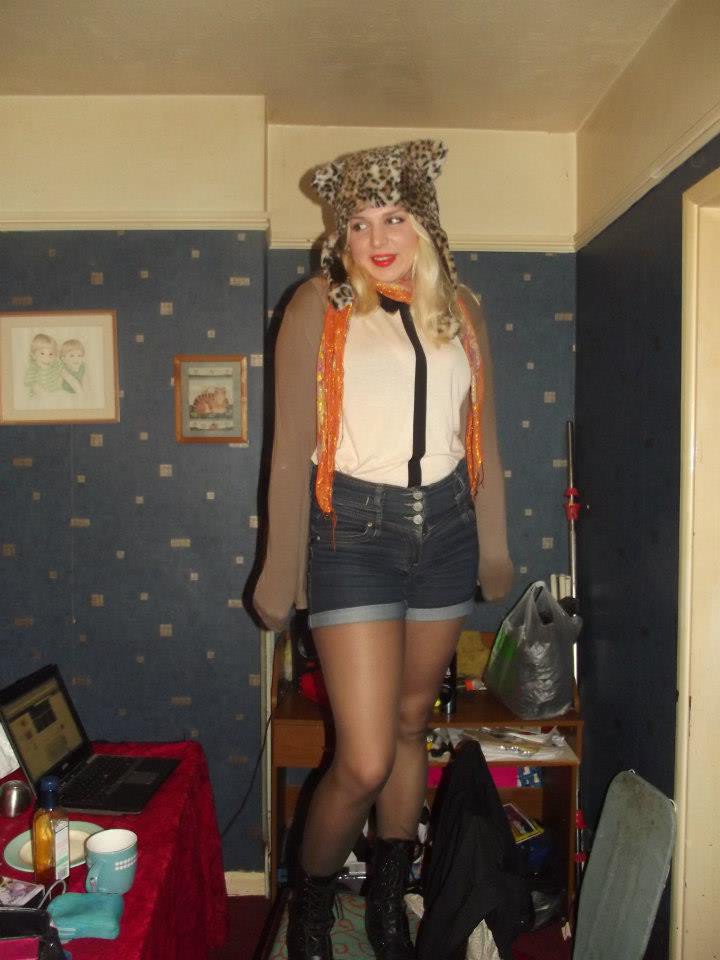 o femeie seducatoare, imbracata intr-o fusta scurta si o palarie eleganta, stand in camera cu parul lung ce-i cad pe umeri. privirea i se indreapta direct spre privitor, iar gatul ii este incadrat de o esarfa senzuala. Isi poarta o camasa alba si pantaloni scurti, emanand un aer provocator intr-un decor steampunk plin de farmec.