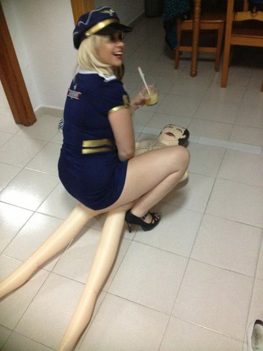 o femeie seducatoare in costum de marinar sta asezata pe podea, cu un zambet sarmant si o bautura in mana. In jur, decoruri din caramizi si plase metalice creeaza o atmosfera transgresiva, iar silueta sa blonda si picioarele lungi incanta privirea. o imagine plina de erotism subtil si provocator, intr-un cadru intim si intrigant.