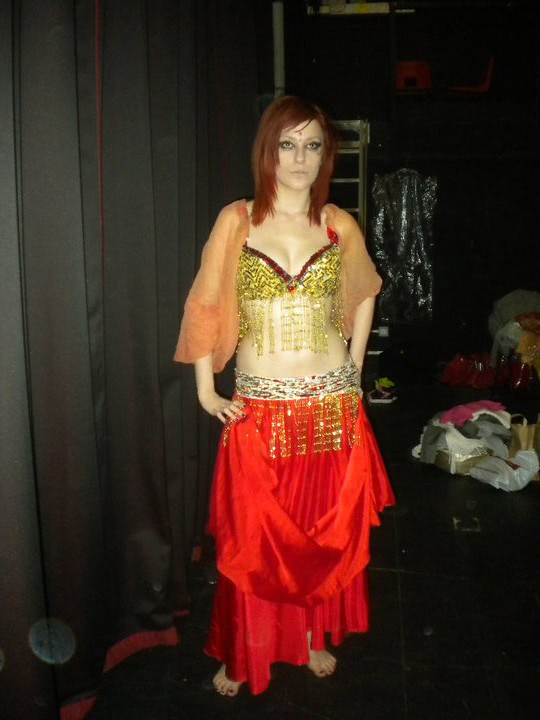 o femeie seducatoare, imbracata in costum de dans oriental, se afla intr-un decor intunecat cu perete si cortina negre. cu parul lung si saten, pozeaza senzual, evidentiind bustul plin si cleavage-ul apetisant. mana pe sold, corpul ei gratios si curbele voluptoase emana erotism subtil, intr-o pozitie fermecatoare ce incanta privirea.