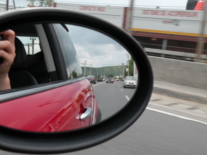 oglinda laterala a masinii reflecta un peisaj incendiar: autostrada agitata si trenuri ce serpuiesc in departare, toate sub soarele zilei. In prim-plan, o tanara seducatoare, cu priviri ispititoare, emanand senzualitate in aerul liber. detaliile precise ale scenei amplifica atmosfera erotica si misterioasa a momentului.