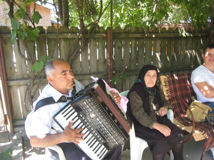 Imagine: flori pentru femei .jpg un grup de oameni relaxati pe o banca, cantand impreuna la acordeon, intr-o curte intima cu un gard in fundal. In mijloc, o femeie frumoasa, fara par si cu trasaturi atragatoare, invaluita de atmosfera plina de pasiune si erotism subtil. detaliile intime ale scenei evoca dorinta si conexiune profunda intre cei prezenti.