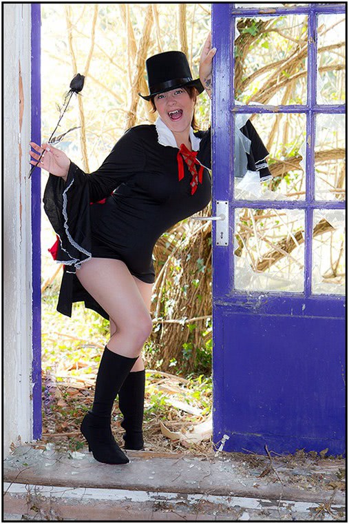 o femeie seducatoare, imbracata intr-o rochie neagra si palarie de magician, stand in fata unei usi. pielea sa nuda se intrepatrunde cu hainele elegante, iar zambetul sau provocator dezvaluie dintii albi stralucitori. privirea intensa te invita intr-un joc erotic, in timp ce aerul misterios si detaliile subtile amplifica tentatia senzualitatii sale.