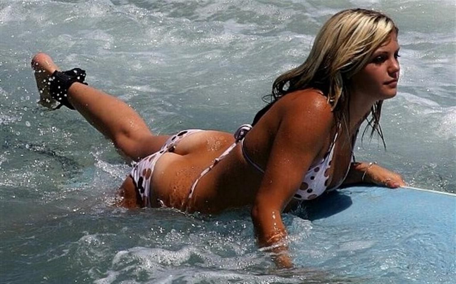 Fotografie: pasarici sexy plaja .jpg o femeie in bikini, cu parul blond si buze senzuale, sta pe o placa de surf, piciorul ridicat in aer. corpul ei frumos se contureaza prin valurile oceanului si apa umeda ce ii acopera pielea. privirea seducatoare si zambetul subtil completeaza scena plina de erotism si libertate pe malul marii.
