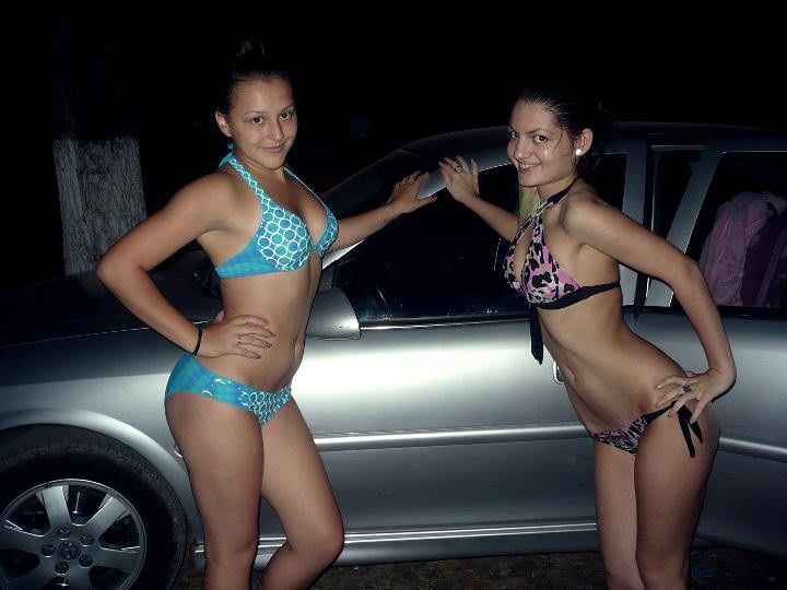 Imagine: 252153 257204777640214 100000520807535 995944 313639 n .jpg doua femei in bikini stau langa o masina in timpul noptii, una dintre ele tine o conserva, pozand senzual. detalii picante includ par negru, sanii, piele intunecata si zambet provocator. o atmosfera de mister si seductie este accentuata de bijuteriile stralucitoare si costumul de baie sexy. o imagine erotica ce emana feminitate si exotism.