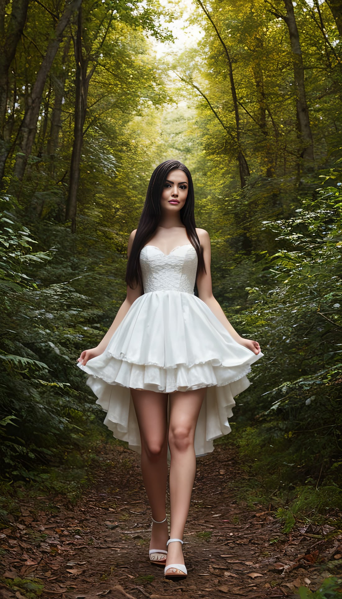 Foto: sexy playboy andreea mantea nude .jpg o femeie seducatoare in rochie alba, cu picioarele crapate si soldurile accentuate, paseste prin padure, privirea provocatoare indreptata spre privitor. parul lung si negru ii cade pe umeri, iar buzele rosii apar atragator intre frunzisul verde. rochia delicata si pantofii albi completeaza un tablou erotic si natural, plin de farmec salbatic.