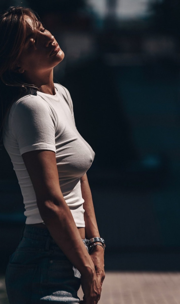 Imagine: sex vacation romania .jpg o femeie in camasa alba si blugi sta pe trotuar, privindu-si cu pasiune de sus catre cer. lumina perfecta accentueaza formele sale voluptoase, iar detaliile erotice precum pieptul bine definit si buzele senzuale ies in evidenta. In jur, un fundal estompat adauga o nota de mister si dorinta intensa.