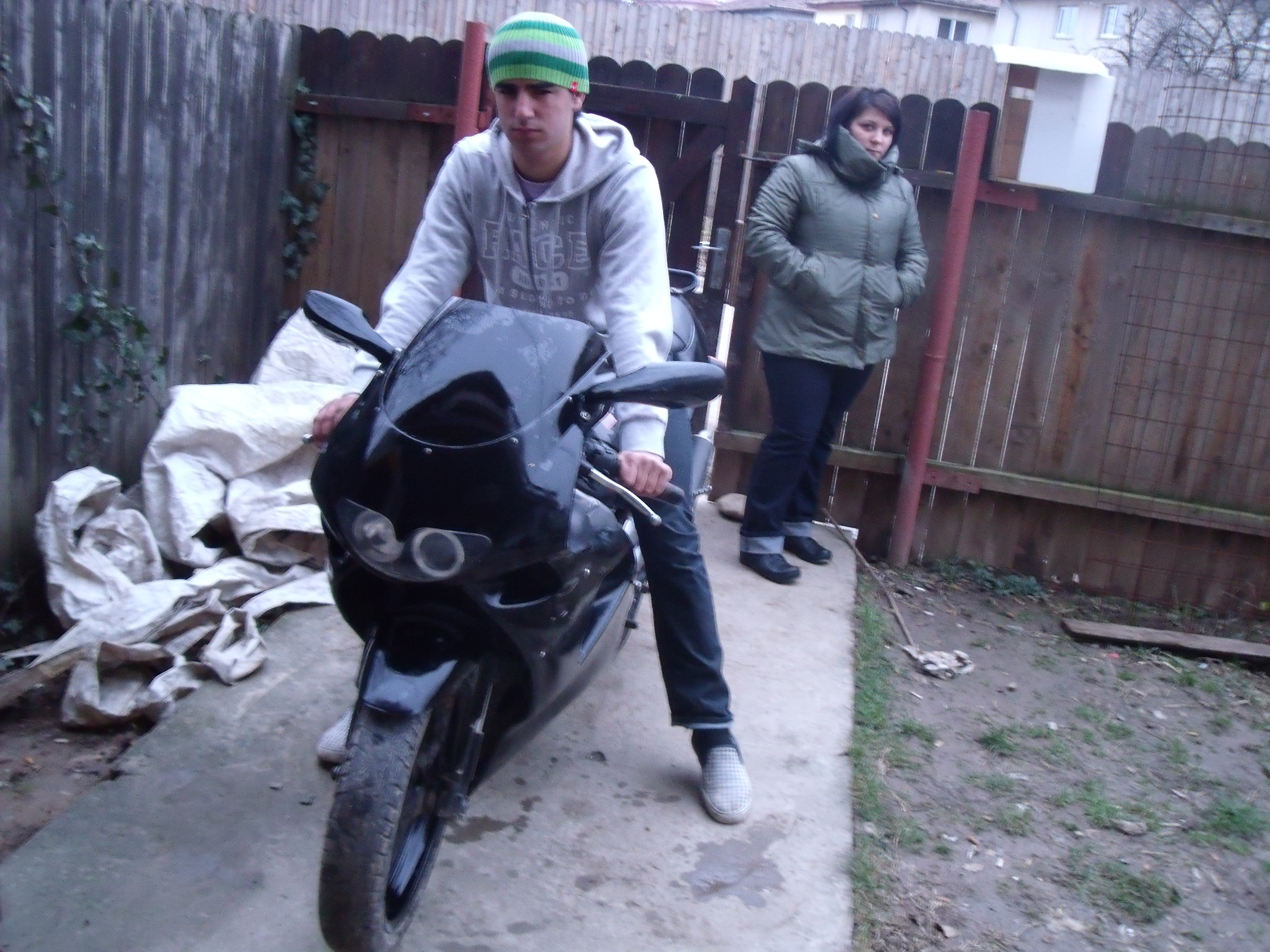 Ilustratie: dame de companie snagov .jpg un barbat seducator sta pe o motocicleta in curte, cu o femeie atragatoare in picioare in spatele lui si un alt barbat ce completeaza scena. In jur, zapada acopera solul, iar copacii si gardul adauga intimitate. femeia poarta cizme sexy si palarii elegante, creand o atmosfera plina de dorinta si mister intr-un cadru exterior incins.