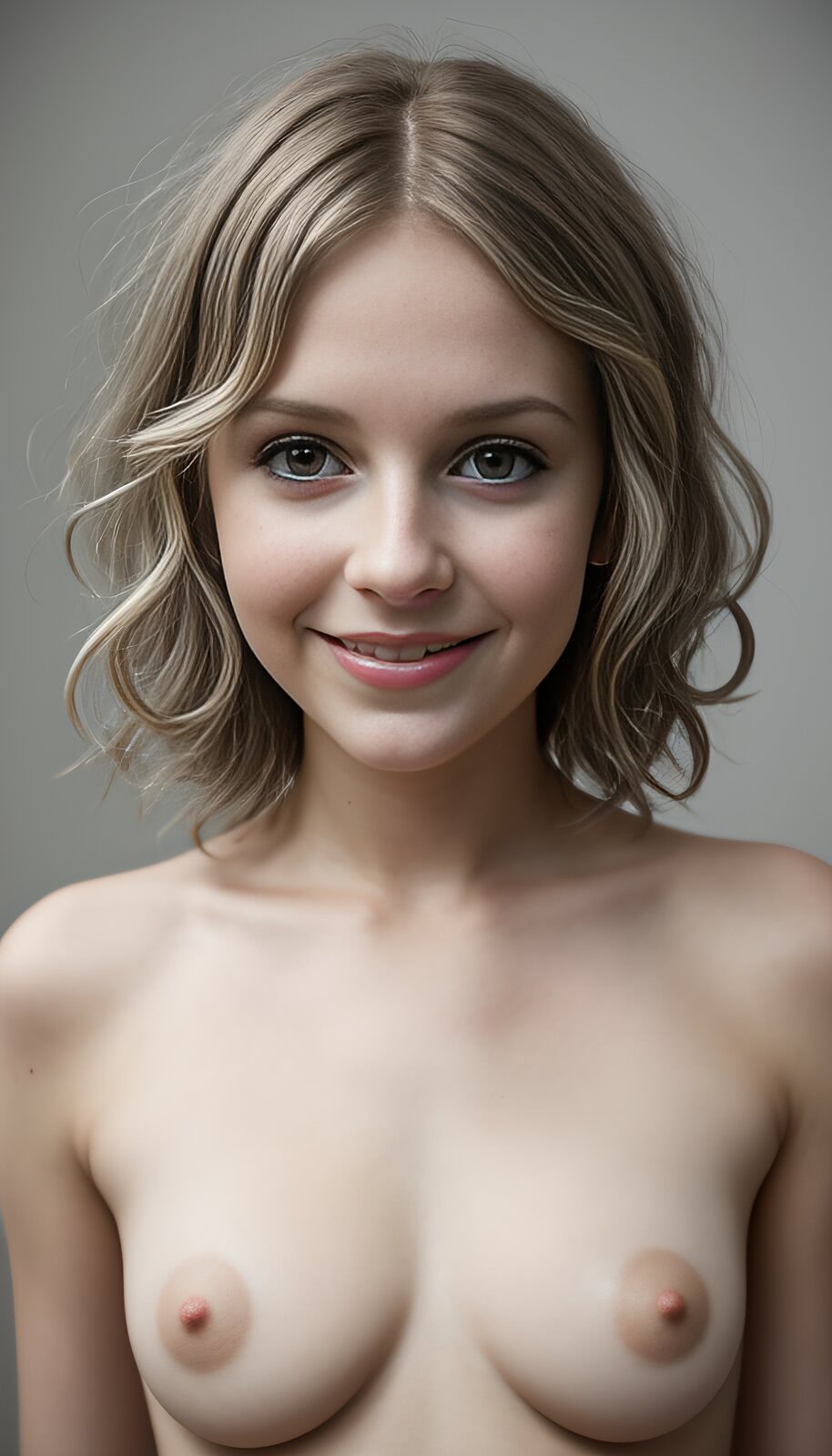 Poza: fete tinere iasi .jpg o femeie goala, cu par scurt si un zambet pe fata si piept, pozeaza intr-o postura arabesque. are un chip frumos, ochi caprui, buze senzuale si privirea indreptata spre privitor. se remarca prin sanii medii, un alunita seducatoare si o dentitie perfecta. fundalul gri completeaza portretul fotorealistic al acestei frumuseti solo.