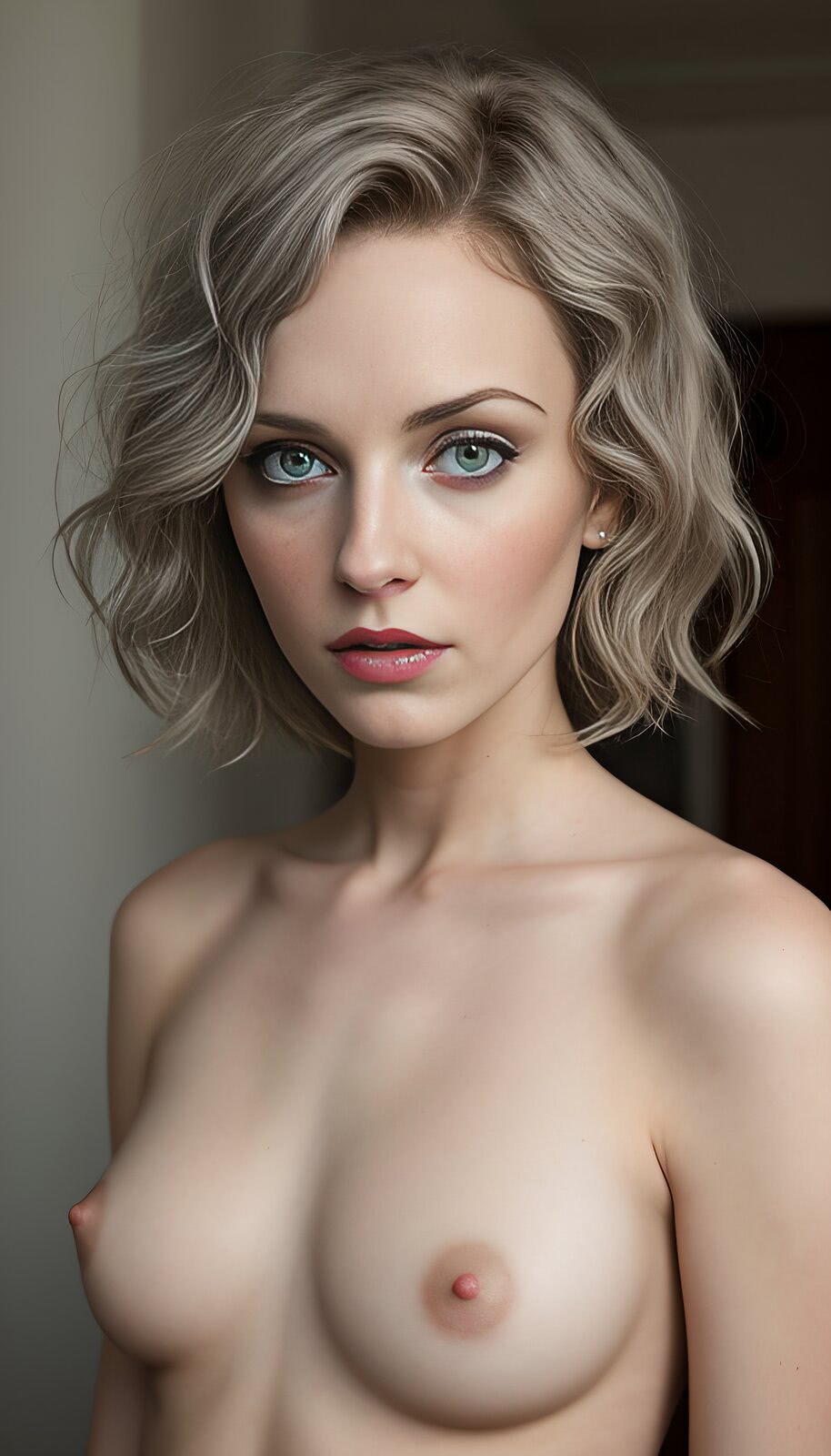 Poza: fete din cugir .jpg o femeie nuda, cu ochi albastri seducatori si par scurt, sta in fata oglinzii, dezvaluind formele ei voluptuoase. sanii medii si sfarcurile sensuale sunt evidentiate de lumina subtila, in timp ce buzele rosii si privirea intensa atrag toate privirile. o imagine realista care imbina frumusetea naturala cu farmecul erotic.