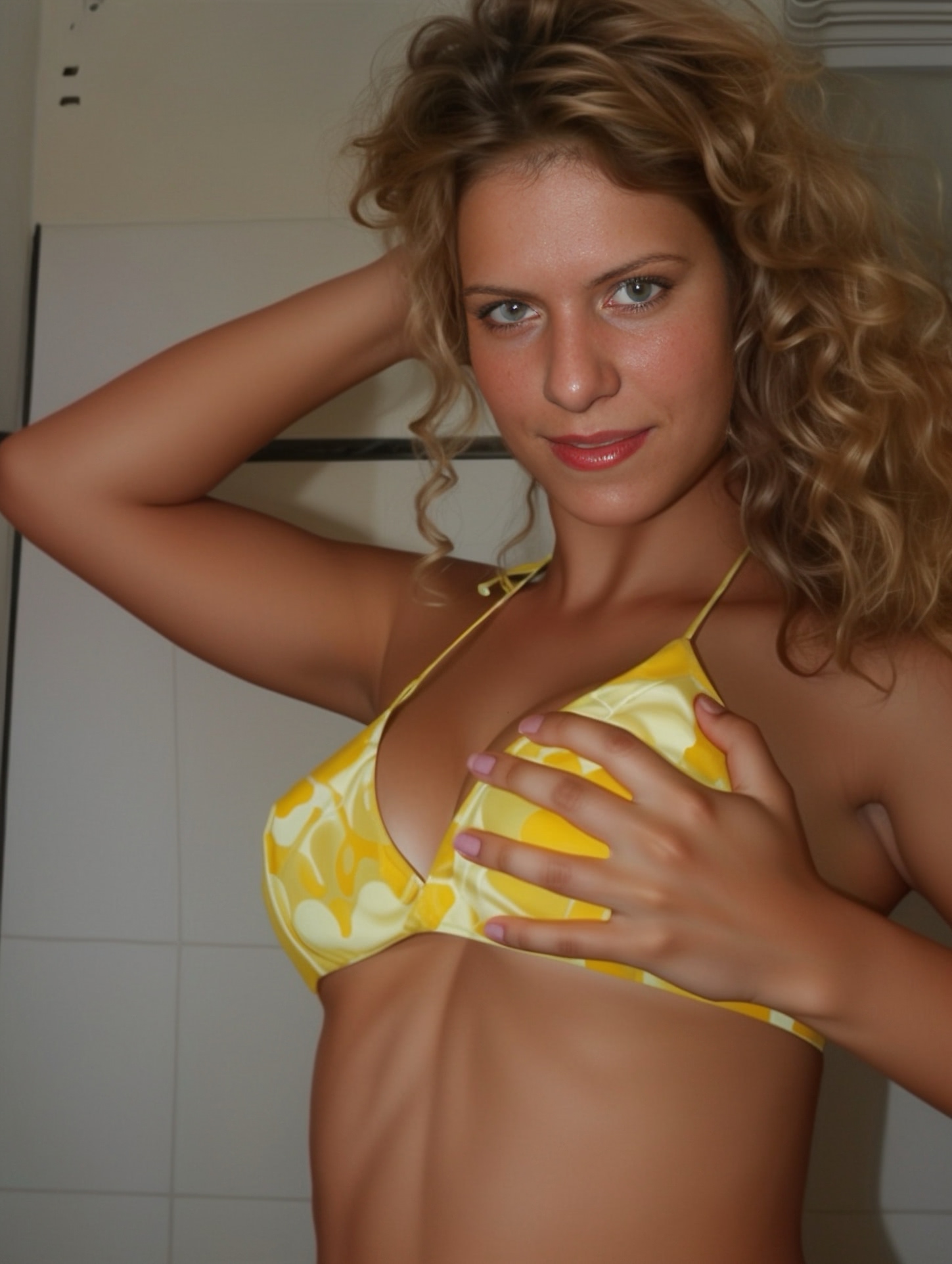 Imagine: femei la domiciliu bucuresti .jpg o femeie intr-un bikini galben, pozand seducator in baie, cu mainile pe solduri si o privire provocatoare. pielea ei luminoasa contrasteaza cu culoarea vibranta a costumului, iar atitudinea indrazneata si gesturile intime ii evidentiaza farmecul erotic. sclipirile din ochi si zambetul subtil adauga un aer senzual acestei imagini pline de pasiune.