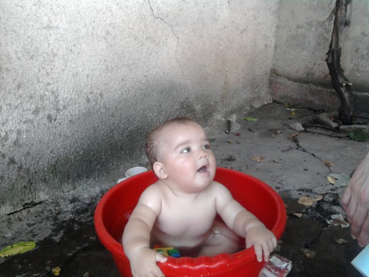 Fotografie: sugar date romania .jpg un copil sezand intr-o cada rosie, cu o periuta de dinti in gura, in timp ce o persoana tine si ea o periuta intre buze. atmosfera calda de vara, realism erotic subtil, privire intensa asupra barbii chelie a barbatului. o scena captivanta plina de senzualitate si mister, unde erotismul se impleteste cu cotidianul intr-un mod surprinzator.
