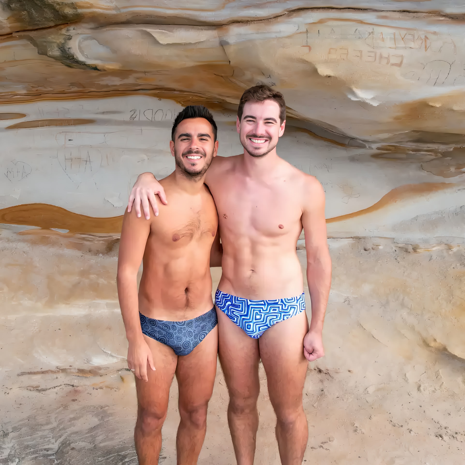 Ilustratie: ghey cauta barbati .jpg doi barbati in lenjerie intima stau unul langa celalalt pe o plaja, cu o formatiune stancoasa in spate si un semn pe perete. detalii picante includ: abs, barba, par negru, ochi inchisi, mustata, buric, sfarcuri vizibile. peisajul cuprinde oceanul si nisipul fin al plajei. o fotografie realista care surprinde masculinitatea si senzualitatea celor doi barbati.