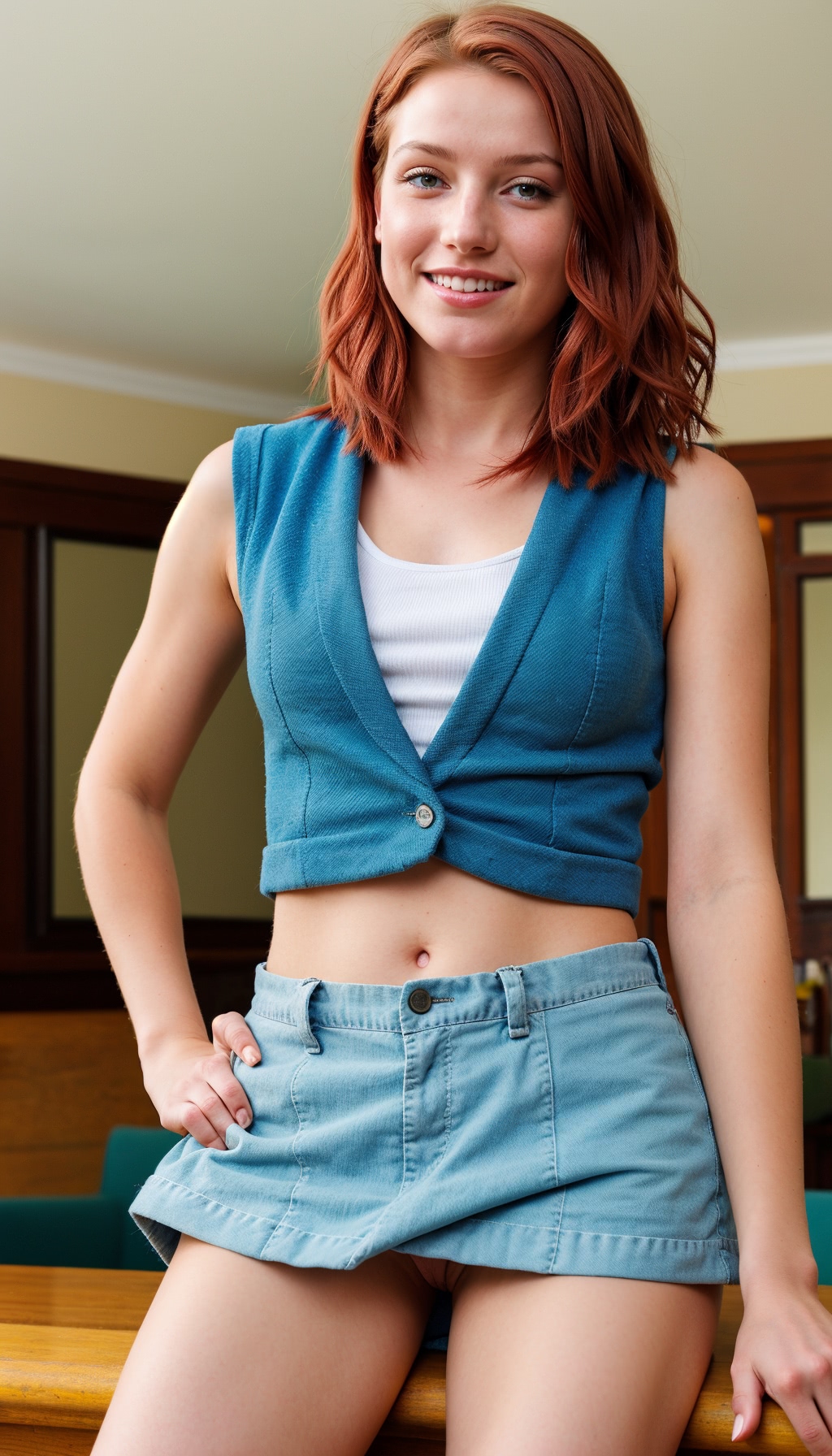 Imagine: link sex whatsapp .jpg o femeie cu par rosu stralucitor, purtand un vest albastru si fusta scurta, isi etaleaza abdomenul dezgolit, iar zambetul seducator ii lumineaza chipul. privirea-i patrunzatoare te invita sa descoperi farmecul subtil al trupului ei voluptuos, invaluit intr-o atmosfera art nouveau plina de romantism si pasiune.
