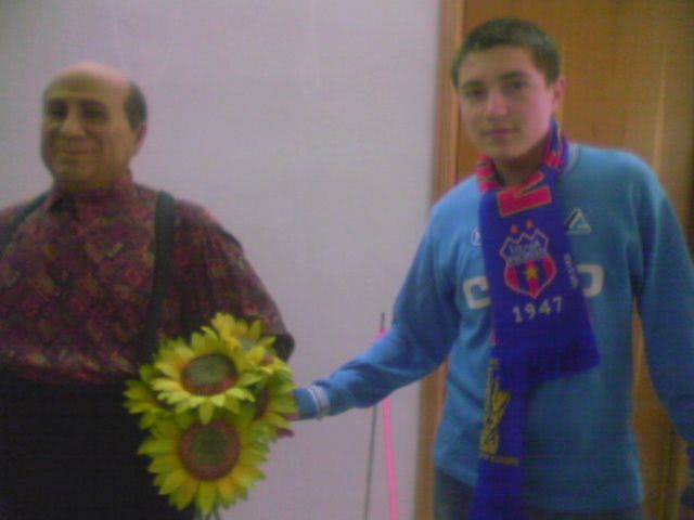Foto: P12 02 05 11 .20[1] .jpg un barbat tine un floarea-soarelui langa un barbat intr-un pulover albastru si o cravata rosie, scoala danube, o fata, doi baieti, par blond, fundal neclar, prim-plan neclar, buchet de flori, aberatie cromatica, fotografie cosplay cu adancime de camp si miscare usoara. o imagine fotorealistica cu detalii erotice subtile.