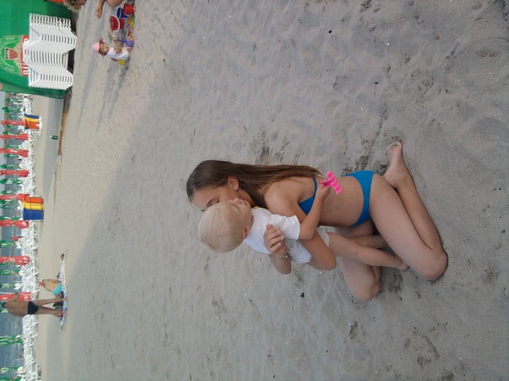 Fotografie: masaj galati la domiciliu .jpg o fetita zvelta, cu parul lung si castaniu, sta in genunchi pe plaja, purtand un costum de baie sexy. In poala tine o papusa adorabila, iar gura ii e umpluta cu o sticlta de apa rece. atmosfera este fierbinte si erotica, intr-o scena plina de senzualitate si libertate sub soarele stralucitor al verii.