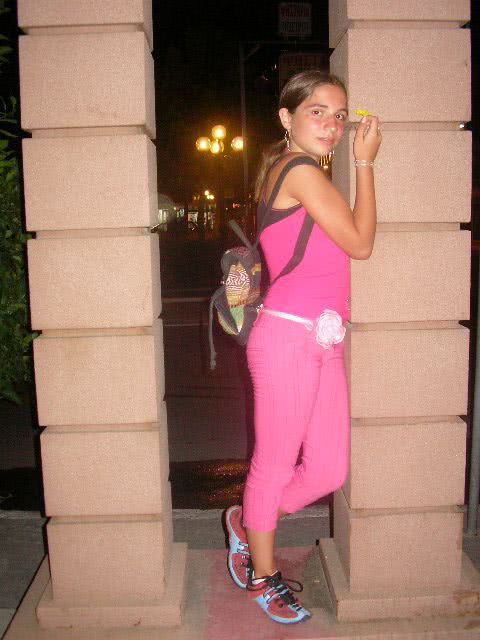 Poza: pjur basic .jpg o femeie seducatoare, purtand pantaloni roz si un top negru, sta agatata de un pilon in noapte. cu parul scurt si o atitudine plina de farmec, savureaza un gogos cu zambet enigmatic. pielea ei delicata contrasteaza cu zidul din caramida, iar accesoriile stralucitoare adauga o nota de rafinament erotic intregii scene.