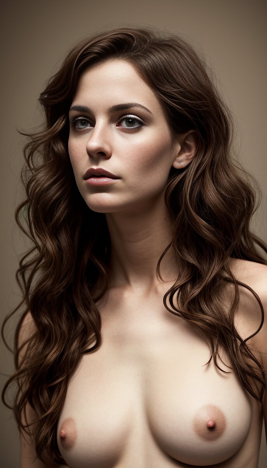 Fotografie: rollerblading the 666 rail .jpg o femeie goala, cu par lung saten si sanii foarte mari, pozeaza pentru o fotografie. parul ii acopera delicat trupul, iar privirea ei seducatoare te hipnotizeaza. detaliile precum buzele senzuale si sanii fermi sunt evidentiate intr-un portret erotic si realist. o atmosfera simpla, dar incitanta, este creata de fundalul maro.