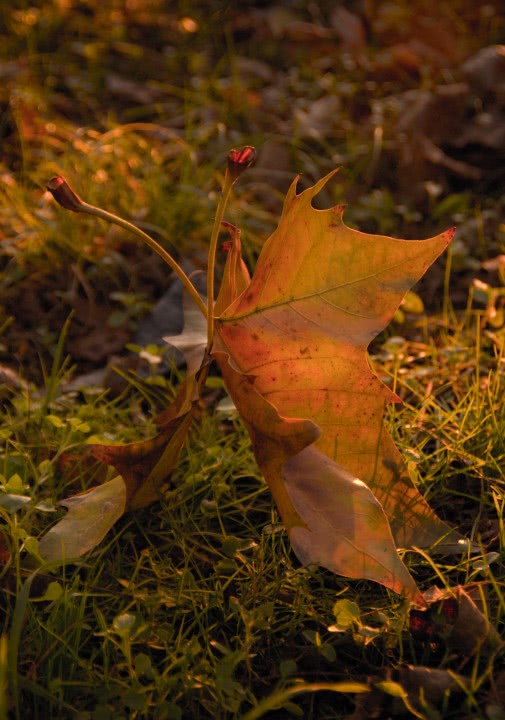 Fotografie: www anutul ro .jpg o frunza singura, asezata pe pamant printre iarba, straluceste sub razele soarelui calde. detaliile sale fine sunt accentuate de o fotografie macro, in timp ce fondul blurat dezvaluie un peisaj autumnal plin de viata si culoare. atmosfera este incarcata de frumusete naturala, cu un aer misterios si seducator al naturii in toamna.