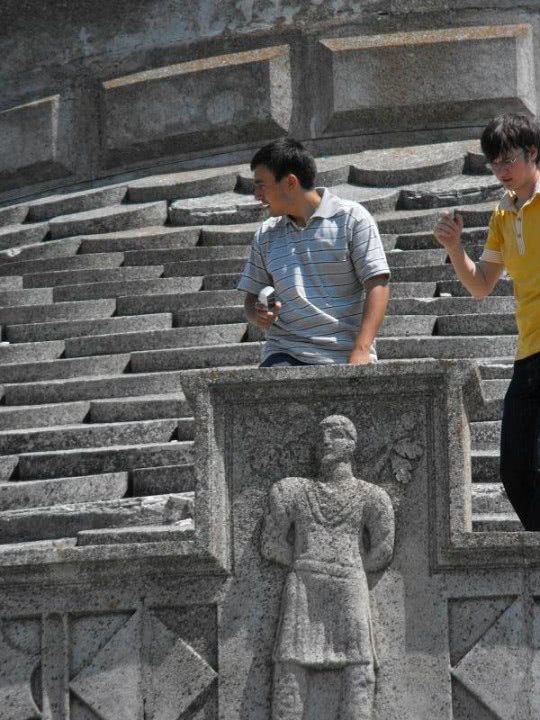 Imagine: www superfemei .jpg doi baieti stau langa o statuie impunatoare intr-o arena goala, in timp ce unul dintre ei priveste cu privire seducatoare ecranul telefonului. fara haine, cu pielea dezvelita si parul negru rebel, acestia emana o energie erotica intensa. stripesle de pe tricouri adauga un aer jucaus si provocator scenei plina de dorinta ascunsa.