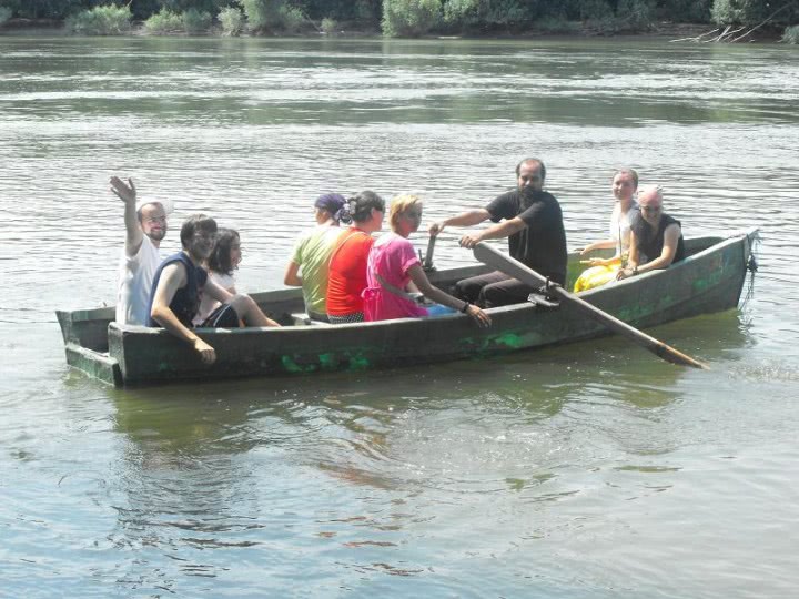 Fotografie: oamgmamr cta .jpg un grup de oameni intr-o barca pe rau, cu un barbat care hya cu mana. fetele in costume intregi se relaxeaza, picioarele lor scufundate in apa cristalina, iar baietii se joaca pe mal. atmosfera e plina de viata si senzualitate, cu valuri line si soare stralucitor ce mangaie pielea dezgolita. un tablou impresionist vibrant si plin de pasiune.