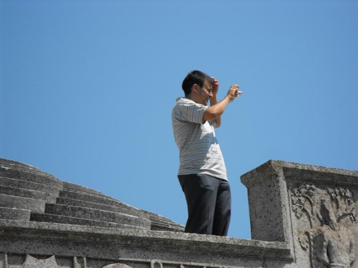 Fotografie: belirea pulii .jpg un barbat sta pe un zid de piatra, surprins in timp ce isi face o fotografie cu telefonul. In prim-plan, o tanara cu parul negru si ochi seducatori, purtand o camasa striata si pantaloni eleganti, emanand senzualitate sub cerul albastru clar. atmosfera de zi insorita amplifica farmecul discret si erotismul subtil al scenei.