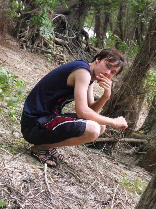 Imagine: sex dr taberei .jpg un barbat ingenuncheat pe o ramura de copac, in padure, cu mana la fata si gura acoperita, intr-o pozitie heroica. Imbracat lejer, in tricou fara maneci si adidasi, se lasa sedus de frumusetea naturii invaluite in umbra copacilor. atmosfera intima si plina de pasiune, intr-un decor luxuriant de verdeata si mister.