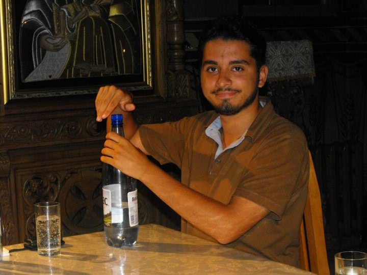 un barbat seducator, cu parul negru si barba deasa, sta asezat la masa, tinand cu mana o sticla de vin rosu. In fata lui se afla doua pahare elegante, unul plin cu alcool rafinat. privirea sa intensa si faciala masculina adauga un aer misterios si erotic scenei intime din interior.
