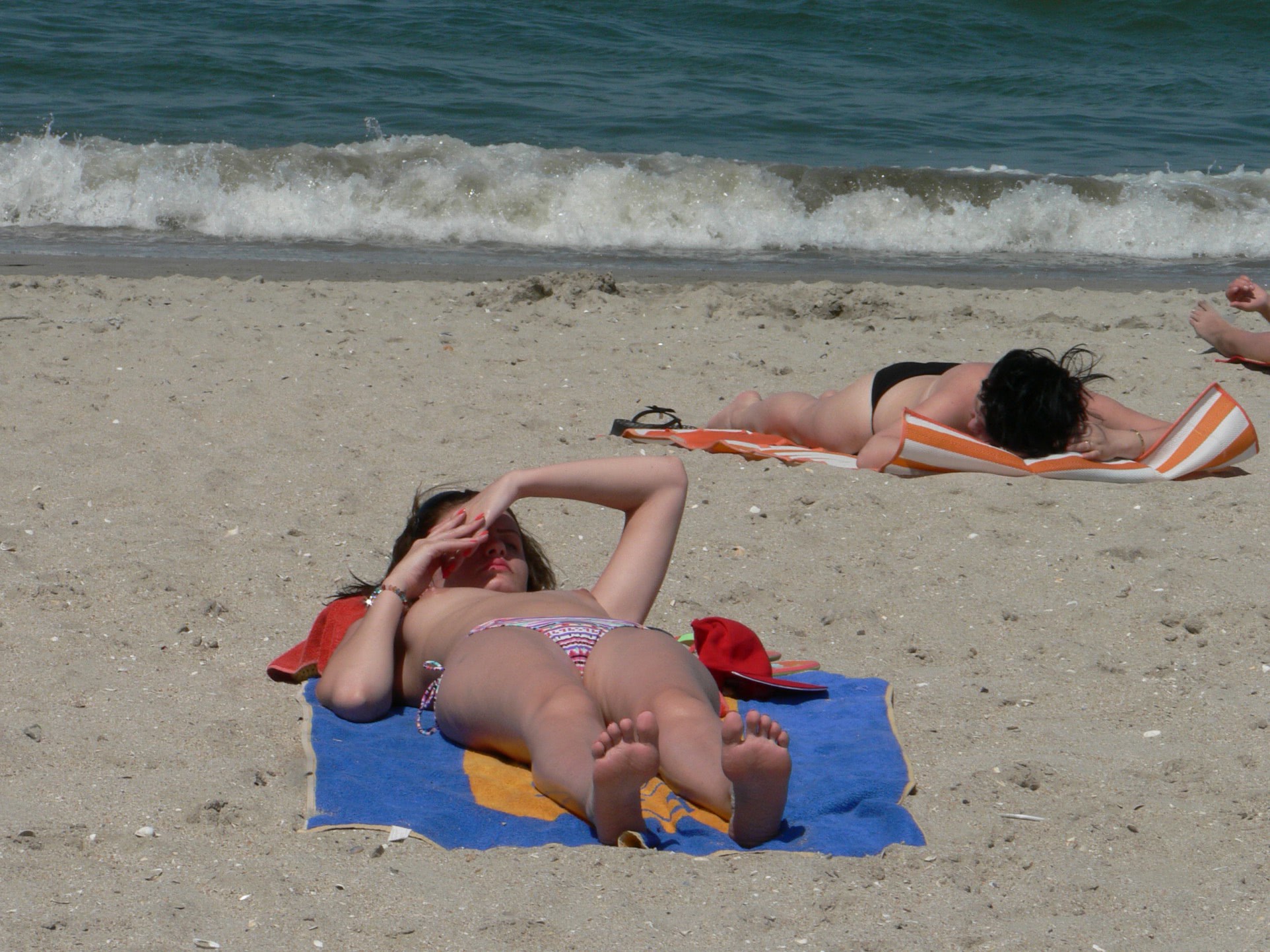 Fotografie: topless la plaja nu ma poza te rog xxx .jpg doua femei se odihnesc pe un prosop pe plaja, cu oceanul in fundal si un prosop albastru. o pictura impresionista a precisiei, cu detalii erotice: picioare goale, par negru, bikini rosu, asimiland natura - crabi, caine, amprente in nisip. orizontul indepartat se contopeste cu valurile tandre ale marii.