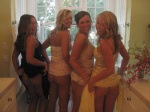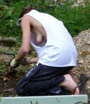 o femeie in fusta albastra, intinsa pe podea cu picioarele larg desfacute, dezvaluind delicat contururile carnoase ale coapselor si fundul voluptuos. pielea palida contrasteaza cu denim-ul si fusta scurta, iar atmosfera erotica intensificata de privirea seducatoare si senzatia de libertate purtata doar de subtiri lenjerii.