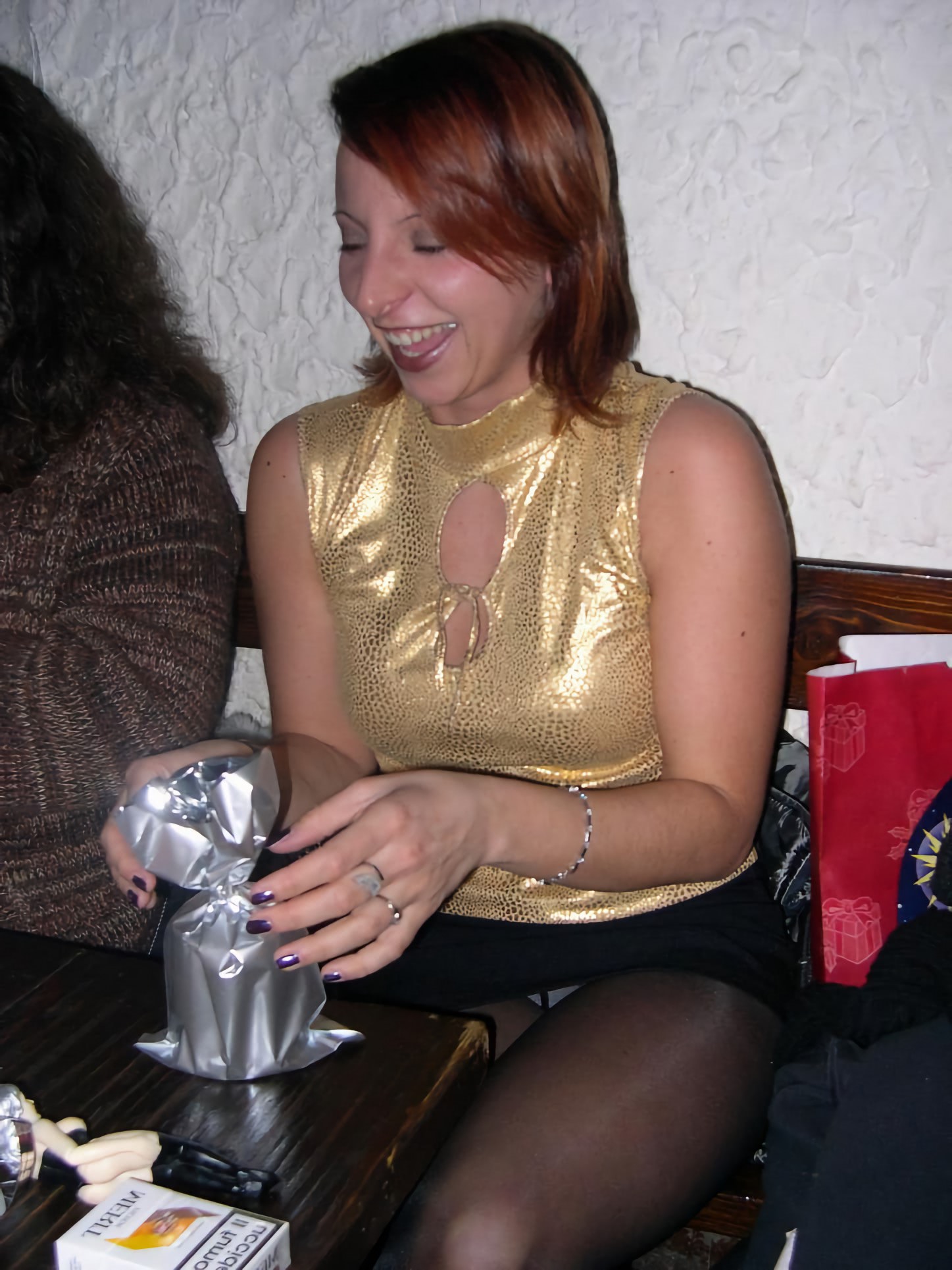Foto: upskirt candid tennis .jpg o femeie sta la o masa cu un obiect argintiu in mana si o geanta rosie in cealalta, arta transgresiva. sculptura de bronz, elke vogelsang, 1 fata, alcool, unghii negre si albastre, bijuterii, pantofi de dantela, par brun, ochi inchisi. detalii erotice: sanii ei fermi subtireti se contureaza sub hainele ei elegante. o atmosfera senzualitate este accentuatata de inelele stralucitoare pe degete.