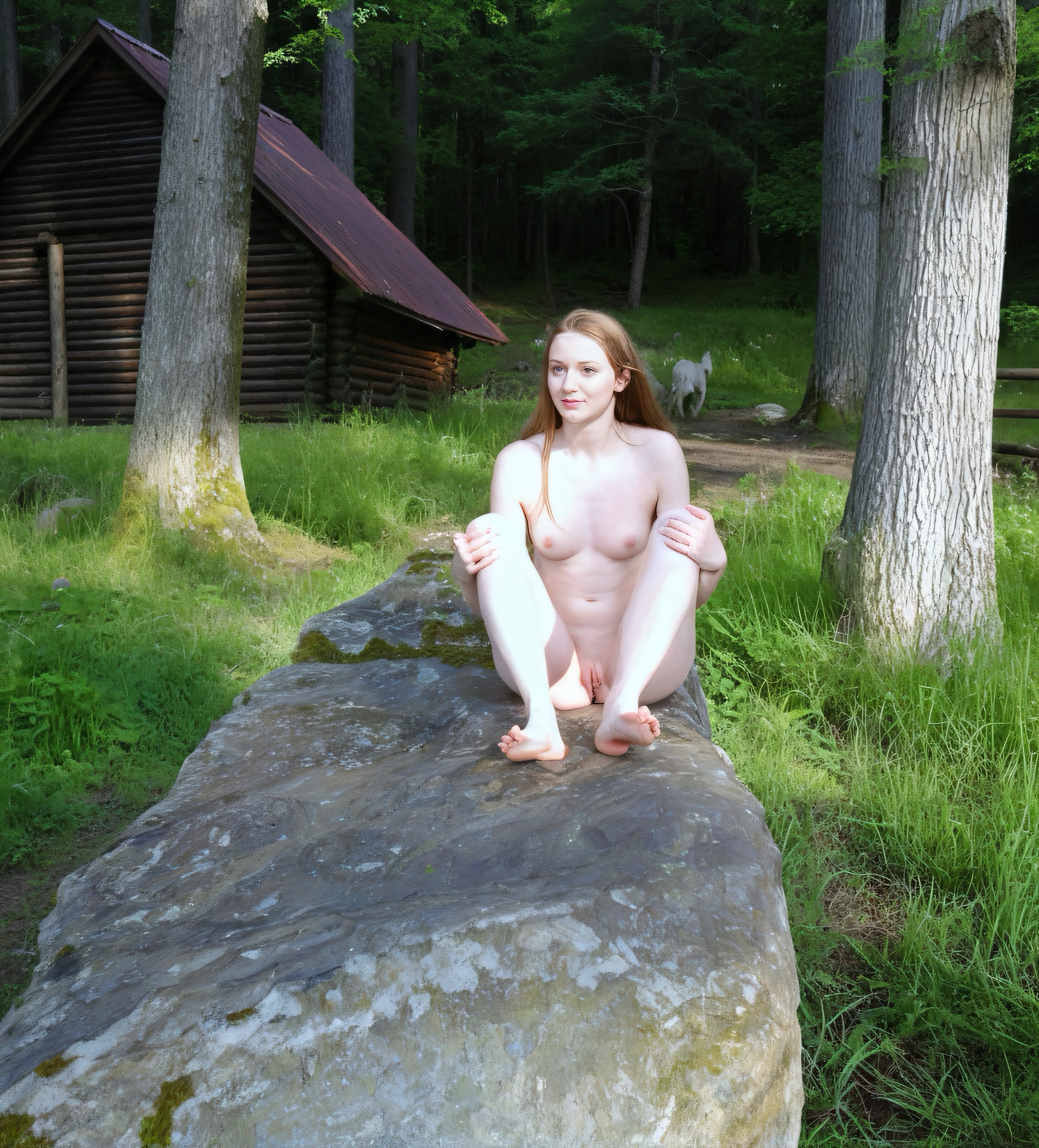 Poza: tinder site .jpg o femeie nuda sedea pe o stanca in padure, langa o cabana si copaci inverziti. pielea ei palida si parul lung incantau privirea, iar corpul sau delicat, cu sani moi si abdomen plat, era complet dezvelit. In jur, natura luxurianta cu iarba verde si muschi acoperea terenul, creand un cadru natural si seducator.