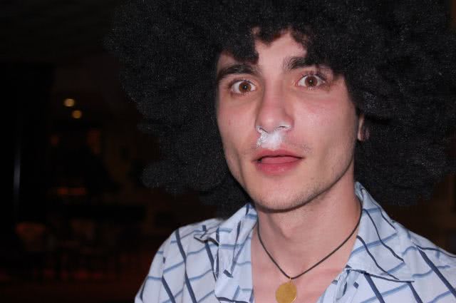 Poza: tranny brasov .jpg un barbat cu un afro si nas false poarta un colier cu un disc de aur, luminat subtil in noapte. In jur, stele stralucitoare si particule luminoase creeaza o atmosfera magica. o fata cu parul negru si ochi caprui completeaza scena, ademenind privirea spre cerul plin de galaxii si comete ce danseaza peste peisajul nocturn seducator.